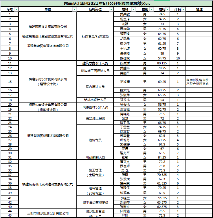 東南設計集團2021年6月公開招聘面試成績公示